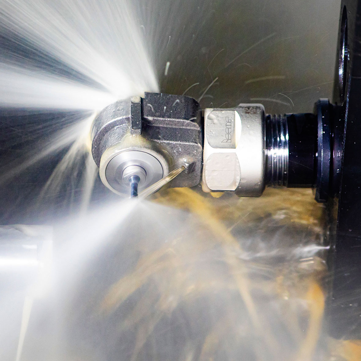 The high-pressure coolant-driven Micro 90 Jet spindle is a small-in-size speed increaser for accurate work in difficult-to-reach areas and is assembled from only six parts (Fig. 3). It enables rotational velocities from 35000 to 53000 rpm while the main spindle of the machine remains idle.
